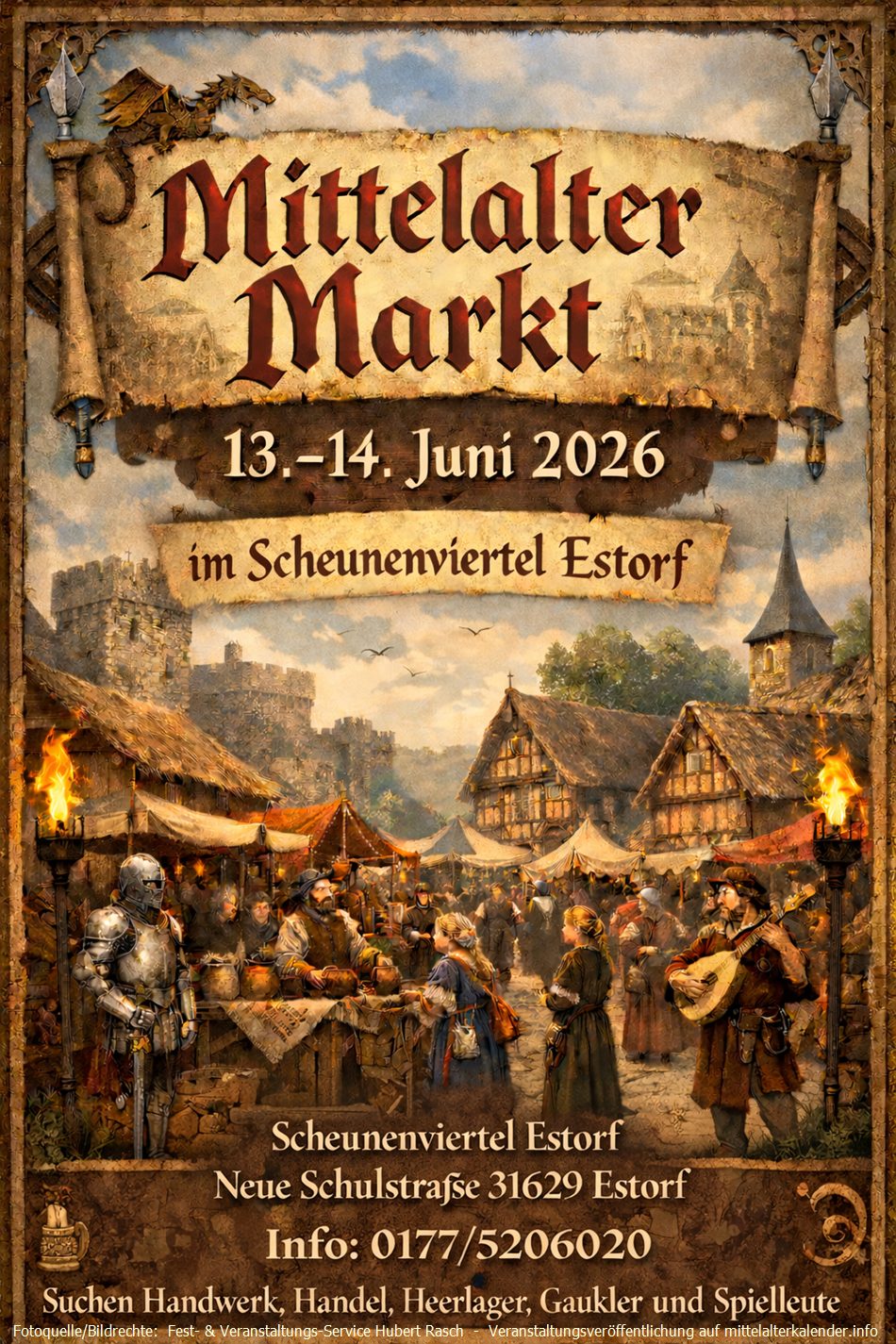 Am 13. und 14. Juni 2026 planen wir erstmals einen Mittelaltermarkt im Scheunenviertel Estorf. Geplant sind Marktstände, Gaukler, Handwerker, Versorgungsstände sowie ein vielfältiges mittelalterliches Rahmenprogramm.