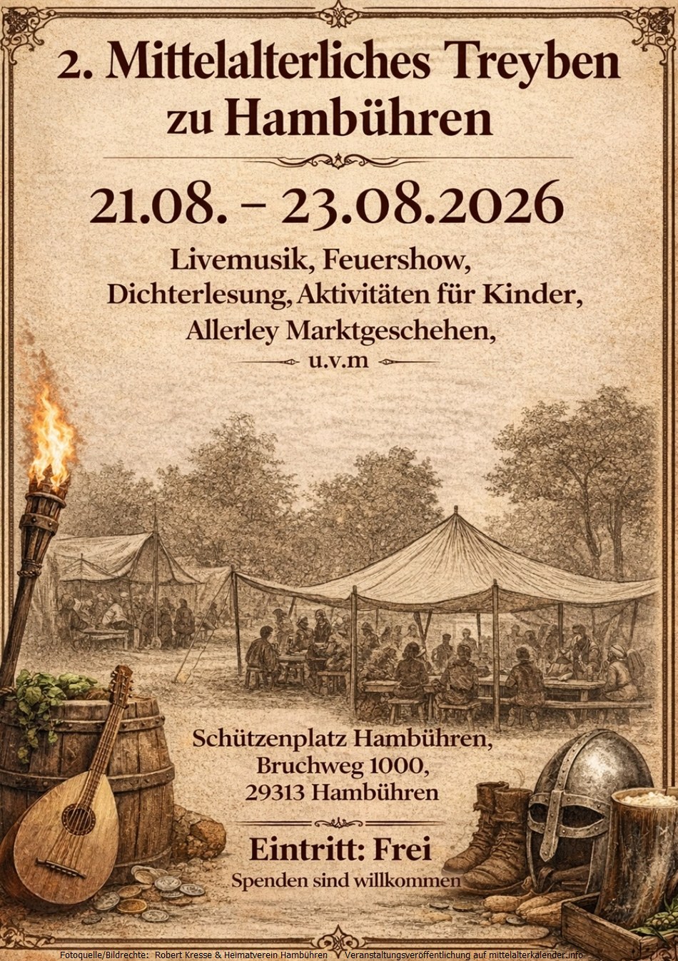 Vom 21. bis 23. August 2026 verwandelt sich Hambühren wieder in einen Ort voller Lagerleben, Handwerk und Spektakel: Das 2. Mittelalterliche Treyben zu Hambühren lädt Groß und Klein ein zum Staunen, Mitmachen und Genießen.