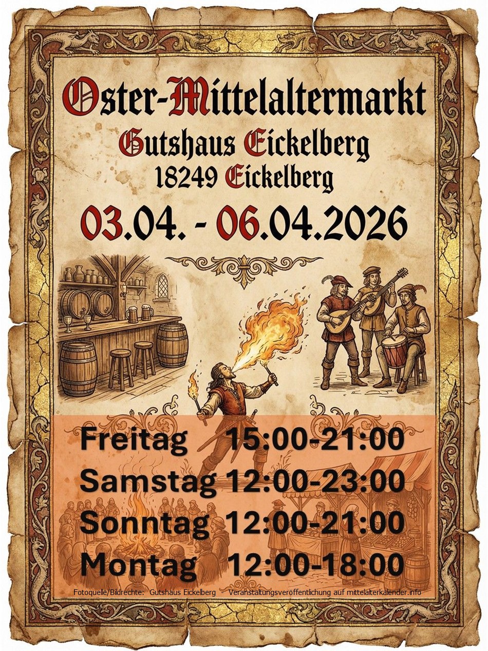 Entfliehen Sie dem modernen Trubel und erleben Sie ein Osterfest wie zu alten Zeiten! Das malerische Gutshaus Eickelberg öffnet seine Tore für einen einzigartigen Mittelaltermarkt, der die Magie vergangener Epochen mit traditionellem Osterbrauchtum verbindet.